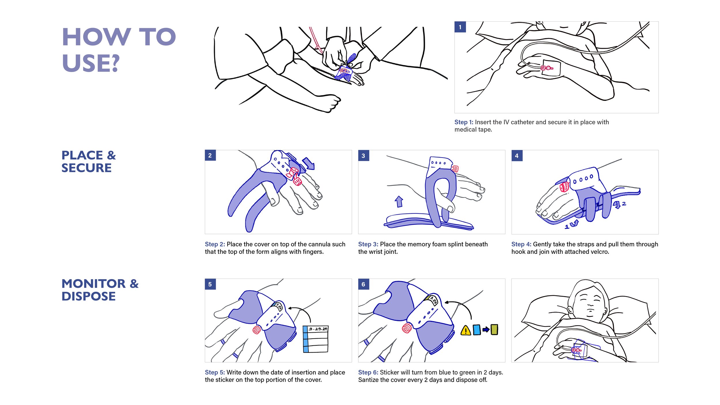 Design a cover for the IV cannula site and splint to ensure